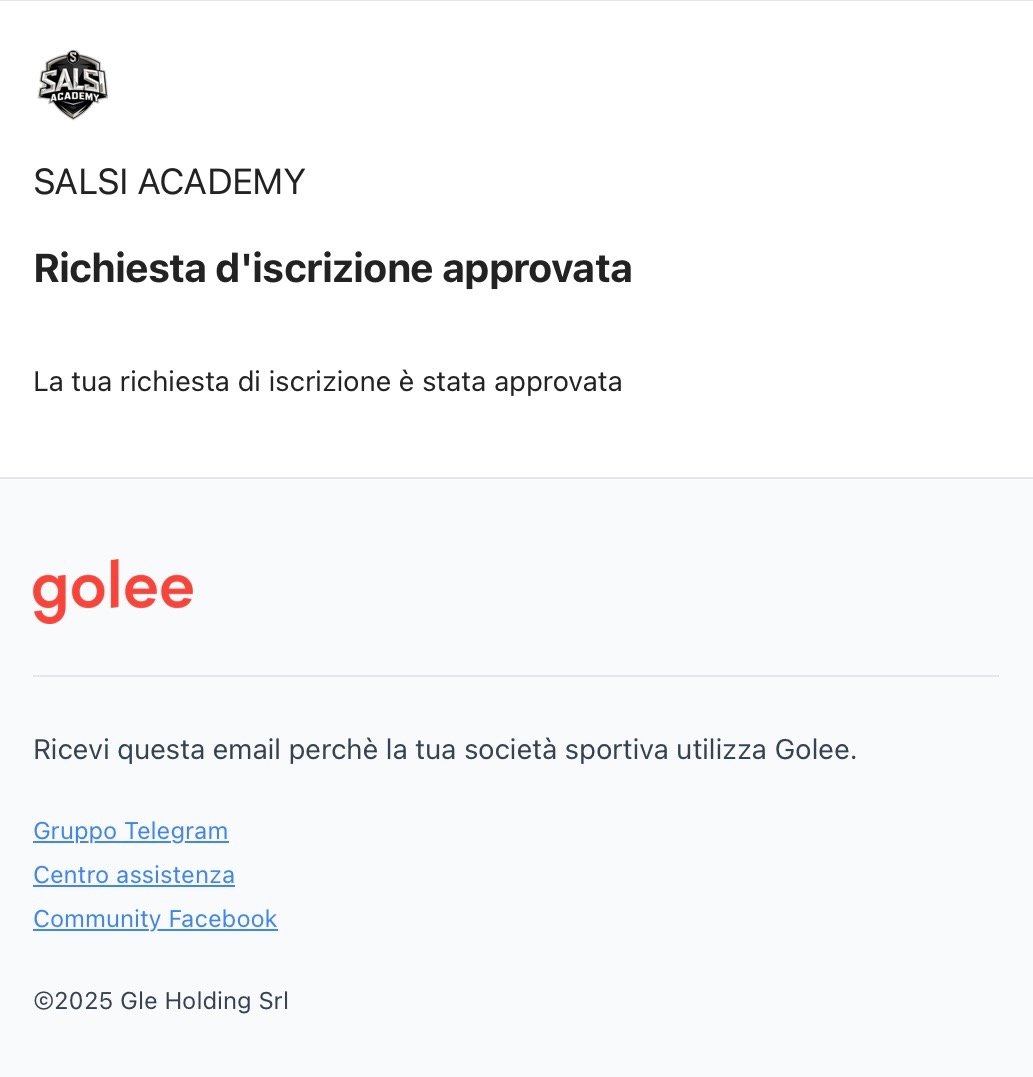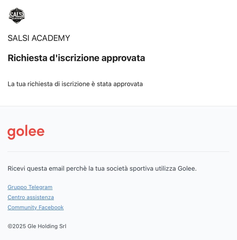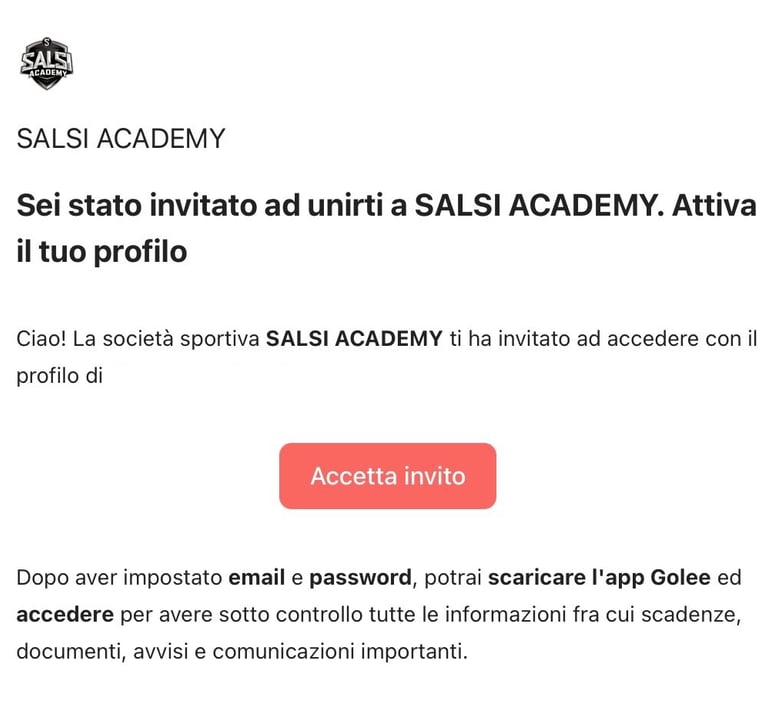 Una volta approvata la tua richiesta, riceverai una mail di invito da Golee e Salsi Academy ASD.